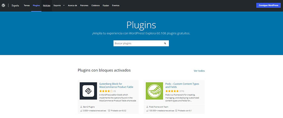 Si estás interesado en comenzar con algunos plugins gratuitos, tu primera parada es el Directorio de Plugins de WordPress: