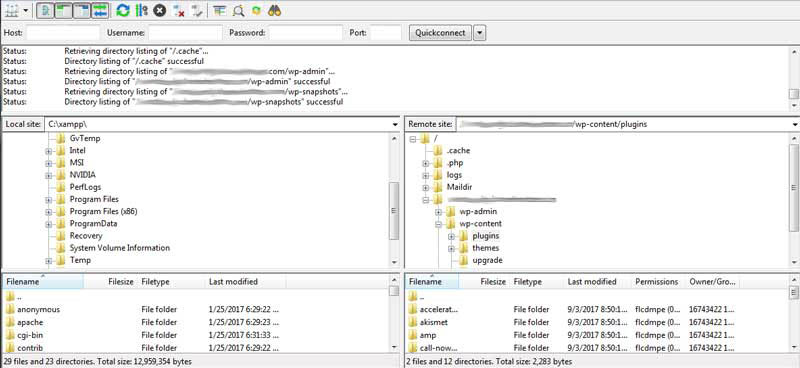 Aquí es donde tendrás que ubicar los archivos de tu nuevo plugin. Descomprímelos primero, luego copia y pégalos en la carpeta de ‘plugins’. Alternativamente, puedes encontrar los archivos en tu computador usando los dos cuadrantes a la izquierda en FileZilla y arrástralos y suéltalos allí (de nuevo, luego de que hayan sido descomprimidos).