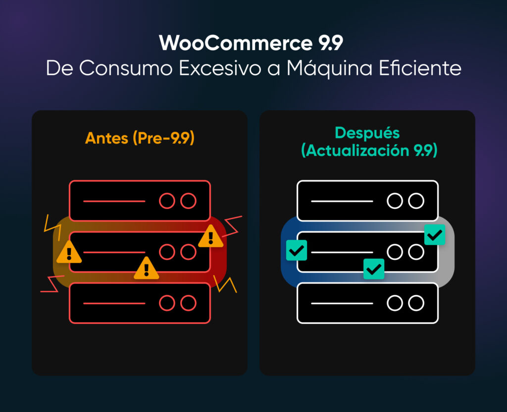 ⚡️La actualización WooCommerce 9.9 cambia por completo las reglas del juego. Ahora los recursos existentes se utilizan de forma mucho más eficiente. Menos consultas a la base de datos. Mejor uso de la caché. Lo que antes generaba alertas de sobrecarga en tu alojamiento ahora se ejecuta sin problemas dentro de los límites de tu plan
