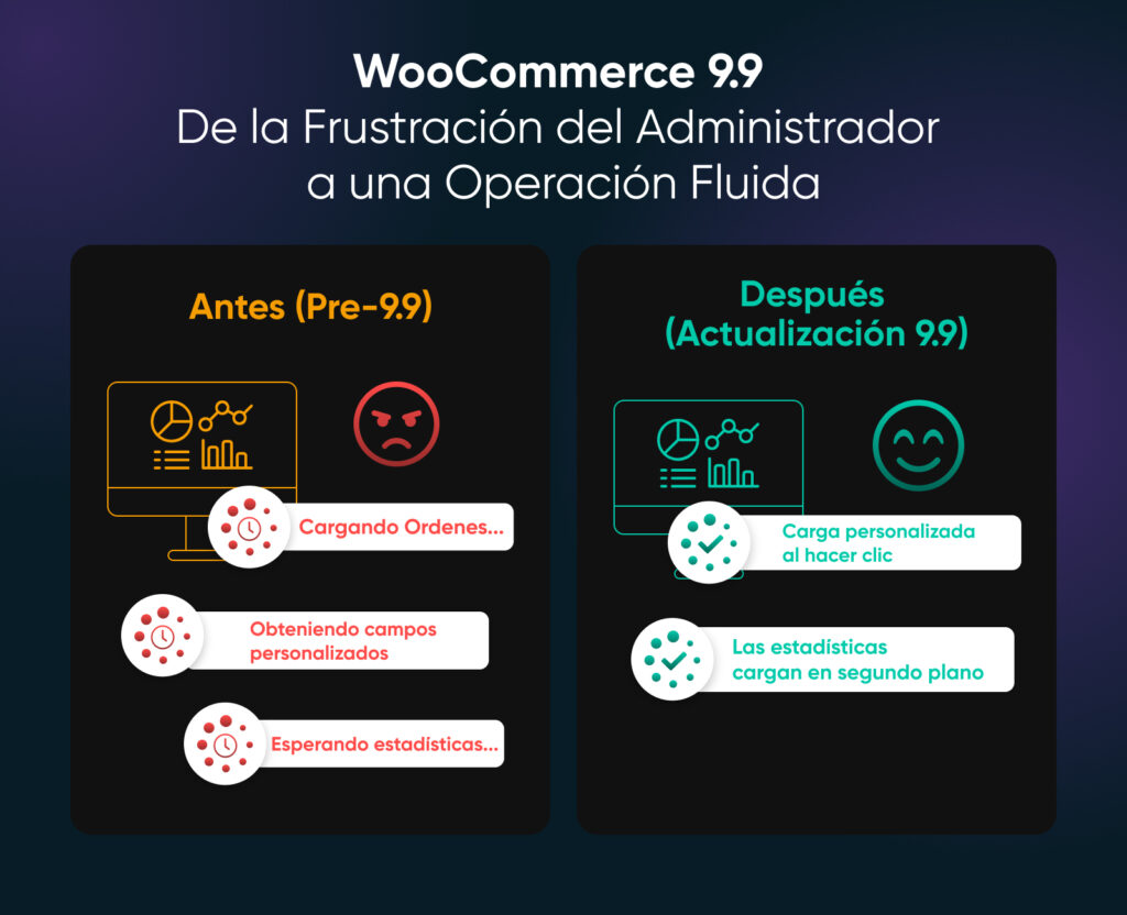 ⚡ Con WooCommerce 9.9, se han implementado optimizaciones sistemáticas en el panel de administración. La pantalla de “Pedidos” ahora usa conteos en caché en lugar de escaneos completos de la base de datos. La gestión de pedidos es instantánea. Editar productos se siente fluido. El dashboard se carga en segundo plano mientras trabajas.