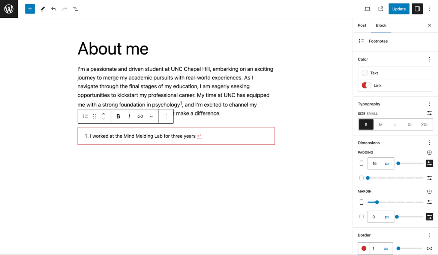 Introducido en WordPress 6.3, el bloque de Notas al Pie de Página sigue creciendo, con más herramientas de diseño. Esto, buscando mayor compatibilidad con más tipos de publicaciones personalizadas: