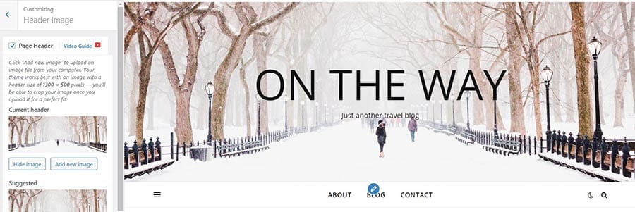 On the customization page, click on Header Image. If you can’t see this option in the menu, it means that your current theme does not support header images.