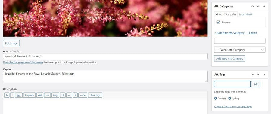 On the Edit Media page, find the Att. Categories and Att. Tags sections on the right-hand side, and start adding categories and tags to your image.