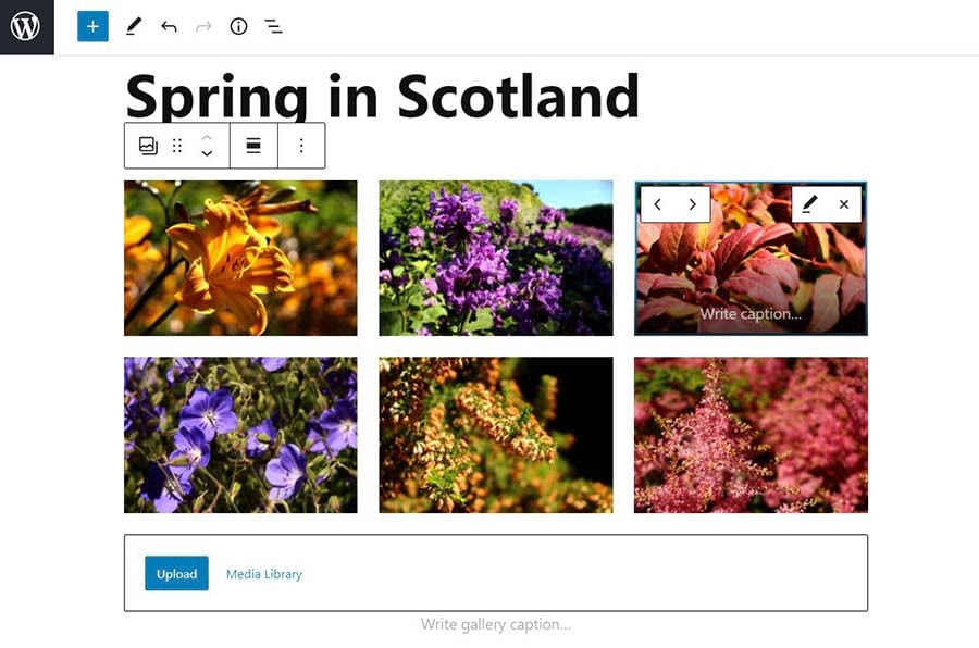 Once your images have been uploaded, you’ll be able to move them around. To do this, you can click on an image and use the arrow buttons. You’ll also see an option to write a caption for your images and the gallery.