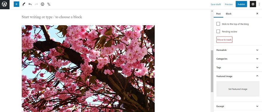 To set a featured image, head to the sidebar on the right, select the Post tab, and navigate to the Featured image section.