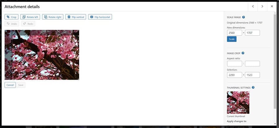 WordPress offers some basic photo editing features. To edit a photo, you can go to your WordPress dashboard and navigate to Media > Library. After you select the image, a window will pop up.