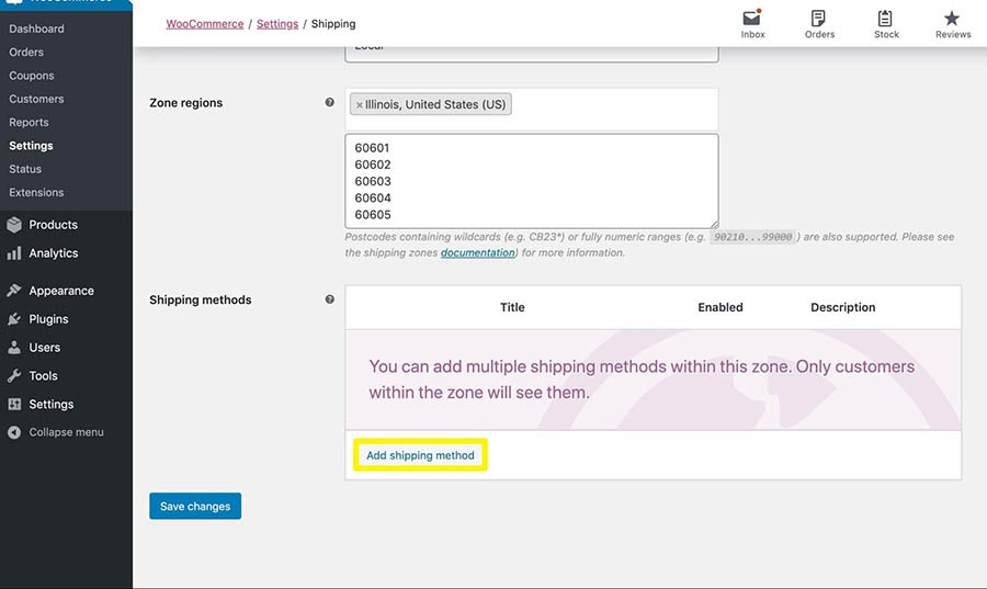 - Still on your local shipping zone page, click Add shipping method