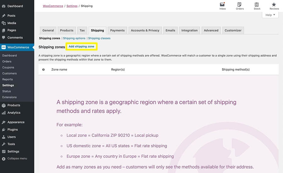 - In your WordPress dashboard, go to WooCommerce > Settings > Shipping
