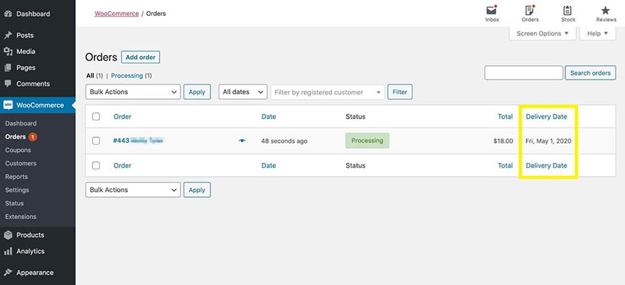 - Enable default sorting of orders by delivery date for the WooCommerce Orders page
