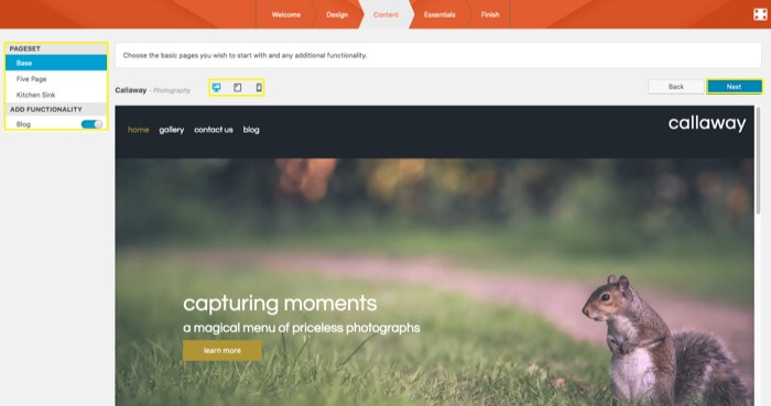 Once you’ve selected the theme you want, you’ll be guided through choosing some custom content options. You can use preset page layouts and menus. You’ll also be able to test your theme’s responsiveness on mobile devices: