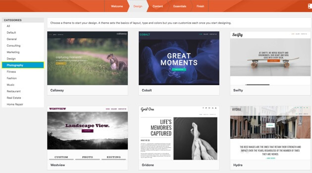 Next, you’ll be able to choose from a menu of theme categories. Our website builder contains many photography themes designed to showcase your skills: