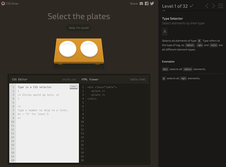 CSS Diner is an online game where you can master selectors. You’ll learn how to specify HTML elements at the beginning of your CSS code and then add styles to those elements, making you pick more advanced and nested elements as you go along.