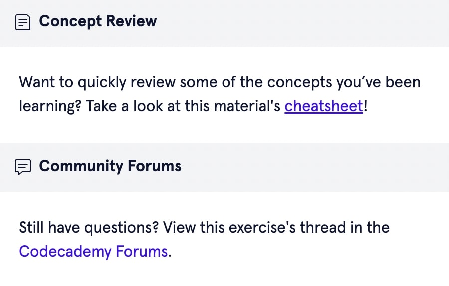 At any point, you can review key concepts using the cheatsheet. You can also browse the Codecademy community forums for that module. These links are provided at the end of each exercise: