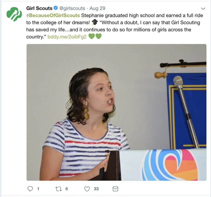 A campanha contínua do Twitter #BecauseofGirlScouts das Girl Scouts oferece a elas uma maneira única de compartilhar conteúdo e — bônus — convida muitos conteúdos gerados pelos usuários de seguidores e influenciadores.
