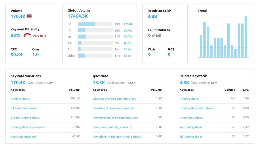 • Conduct keyword research: Identify terms and questions with sufficient search volume that align with your offerings. Keyword planner tools, like Semrush and Ubersuggest, help uncover SEO opportunities.
