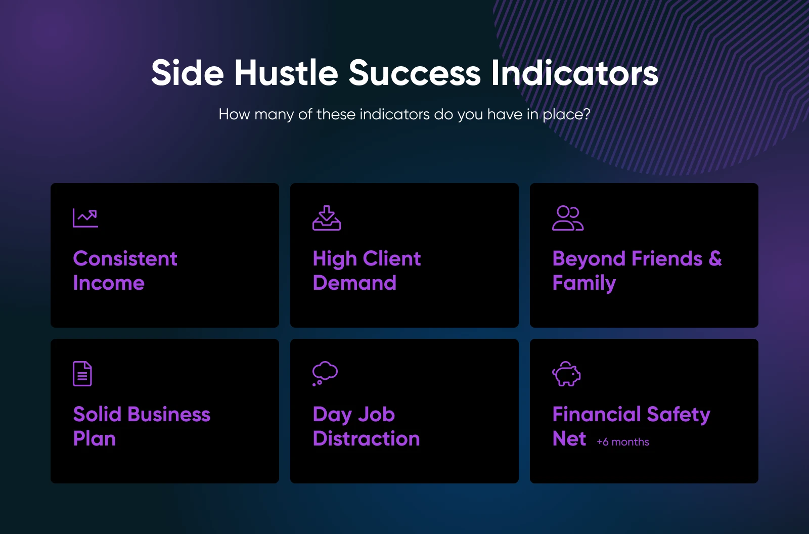 Six Side Hustle Success Indicators: Consistent Income, High Client Demand, Beyond Friends & Family, Solid Business Plan, Day Job Distraction, Financial Safety Net.