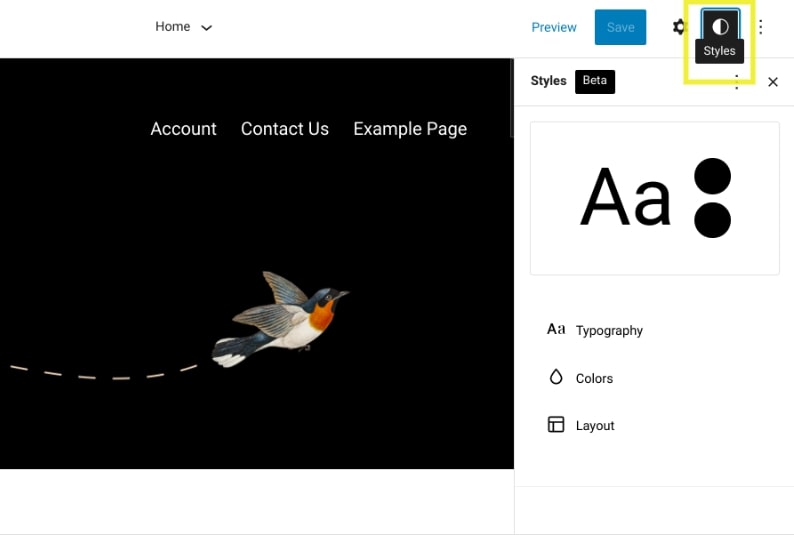 The preview window shows you how the current style of your theme looks. Under the Styles panel, you’ll find settings for: