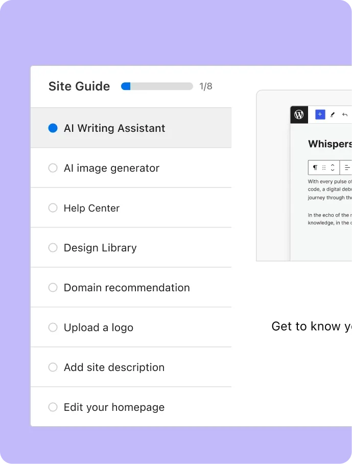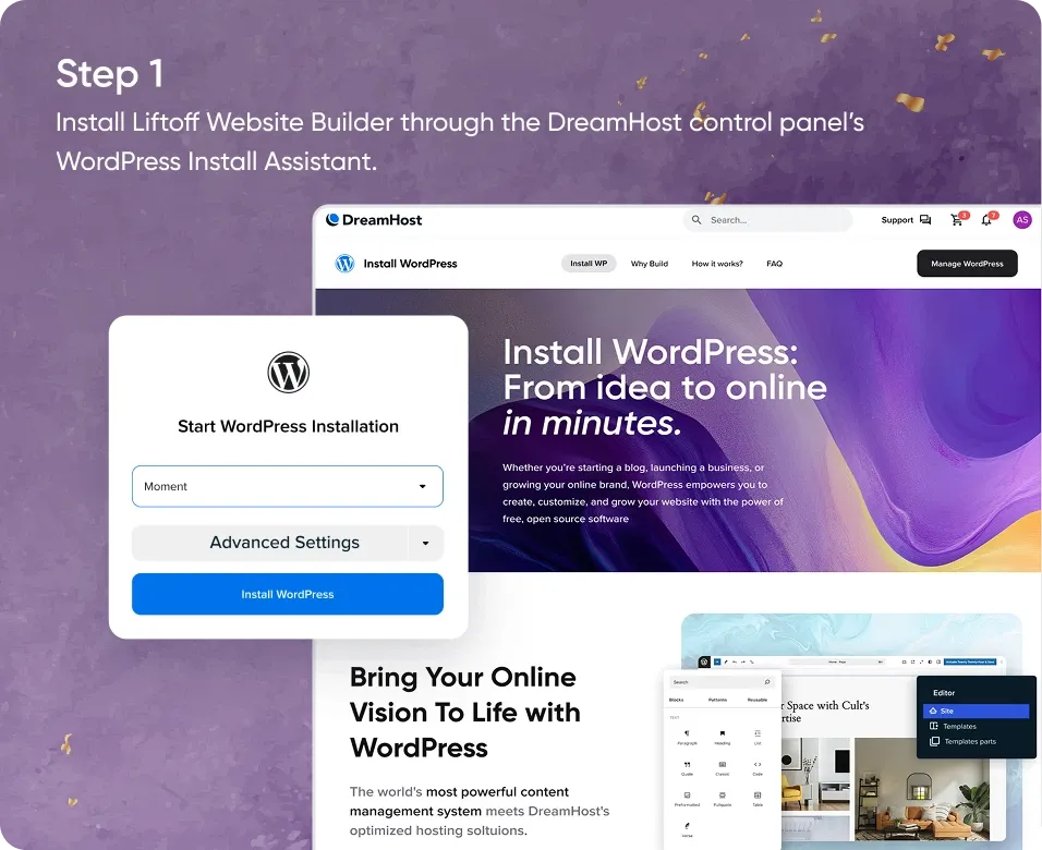 Von null auf Produktivität mit Lichtgeschwindigkeit. Bringe deine WordPress-Seite mit nur einem Klick zum Laufen. Installiere den Liftoff Website Builder über den WordPress-Installationsassistenten des DreamHost-Dashboards und habe deine Seite in weniger als einer Minute bereit.