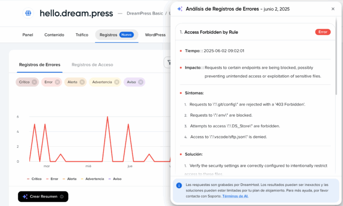 Desde allí, podrás ver los registros de errores y acceso, con herramientas de filtrado, gráficos dinámicos y consejos de resolución de problemas basados en IA.