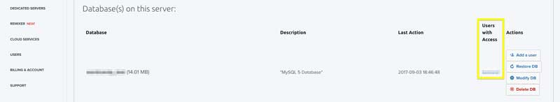 Finally, you’ll need to set up privileges for your user account. Since you’re the administrator, you’ll need complete access. To do this, go to the MySQL Databases screen, find your database at the top, and click the user you just created under the Users Access column:
