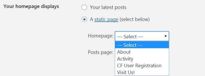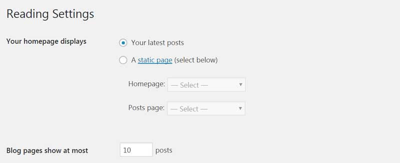 To get started, go to your dashboard and select Settings > Reading. Here, you can choose whether your homepage displays your latest posts or static content: