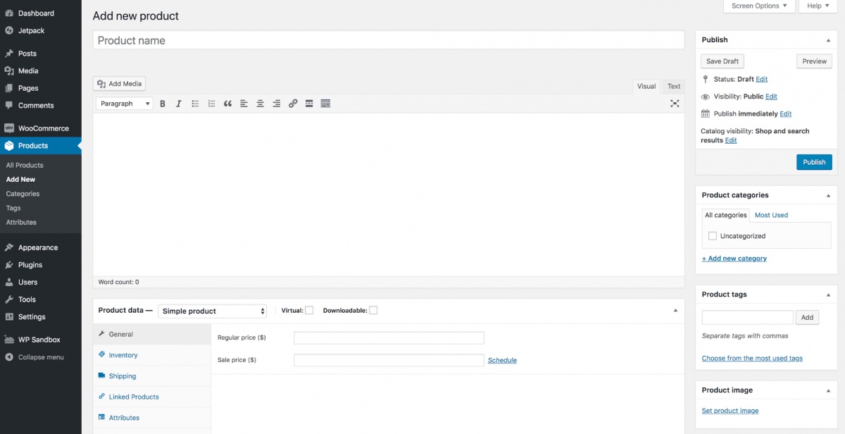 To create a product, go to WooCommerce > Products > Add New. This opens the Add new product interface, which should look familiar if you’re used to creating blog posts in WordPress: