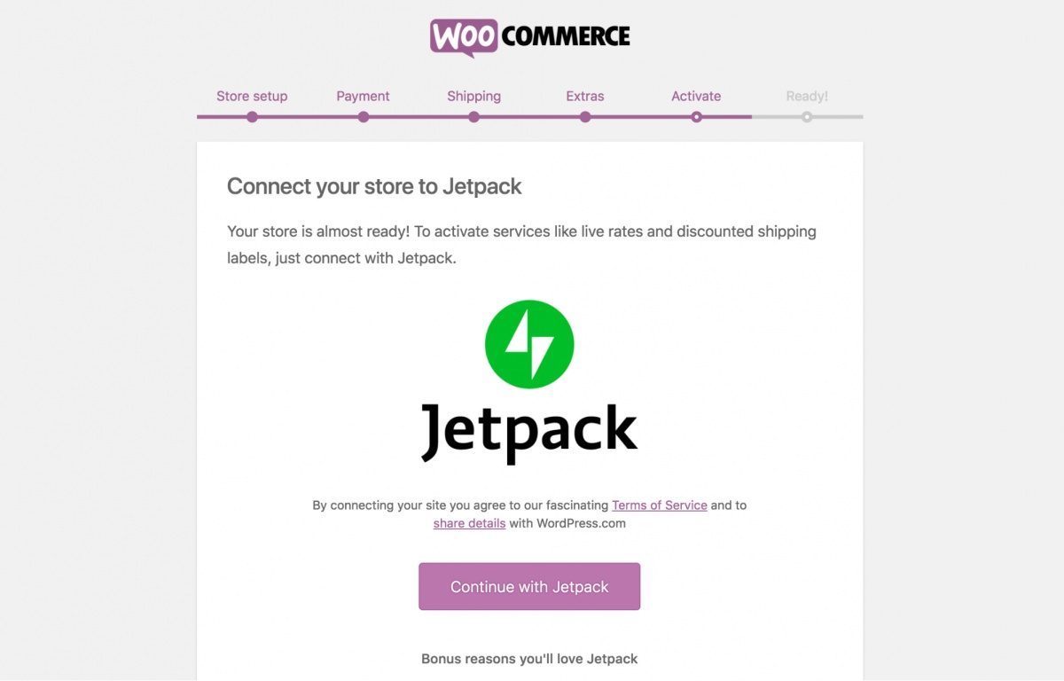 When you select Continue, you’ll come to the final step. Here you can connect your store to Jetpack, a useful plugin that will activate several additional services (such as live rates and automatic taxes):