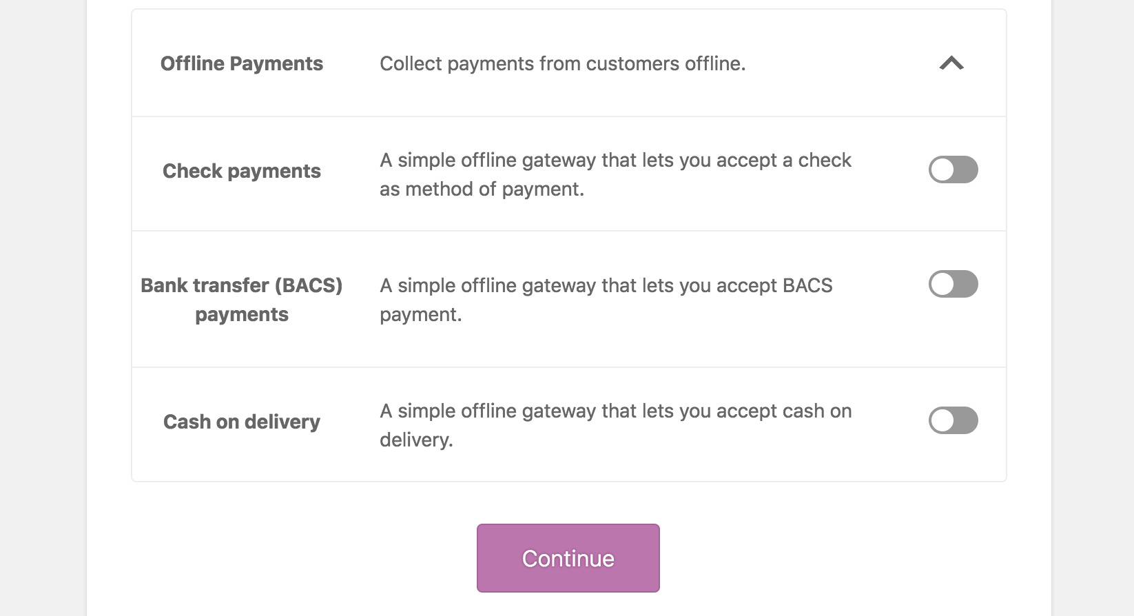 The final option in this section asks if you want to accept offline payments. If you select this, a panel will appear with more detailed options, letting you choose all payment types you’re willing to use: