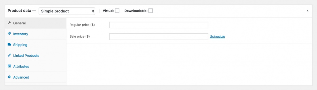 To configure your product’s settings, you can use the Product Data meta box. You’ll spend most of your time here when managing products, as it covers the most essential information: