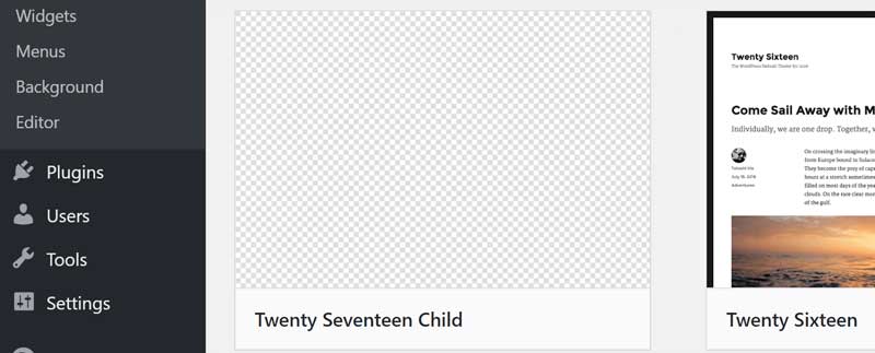 wordpress menu showing the nav bar where you can find "child themes" in "tools"