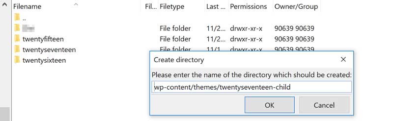 Next, you’ll be prompted to create a child theme directory name. This is the name of the folder within your website’s files.