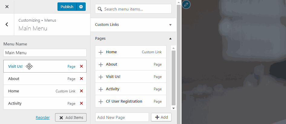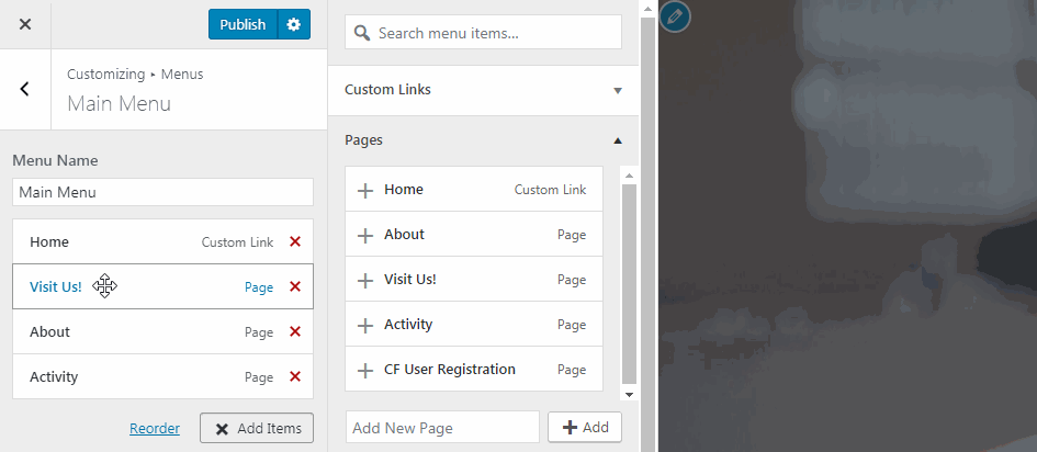To do so, hover over any menu item you’ve added. You’ll see your cursor turn into a crosshair. From here, simply drag and drop the item up or down to reorder it: